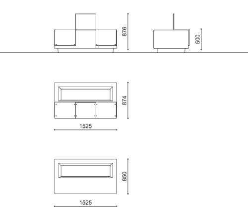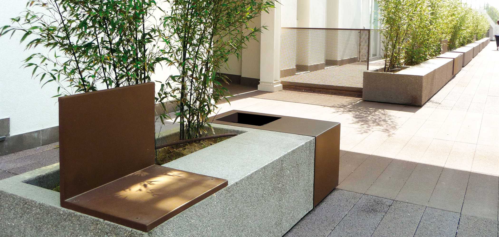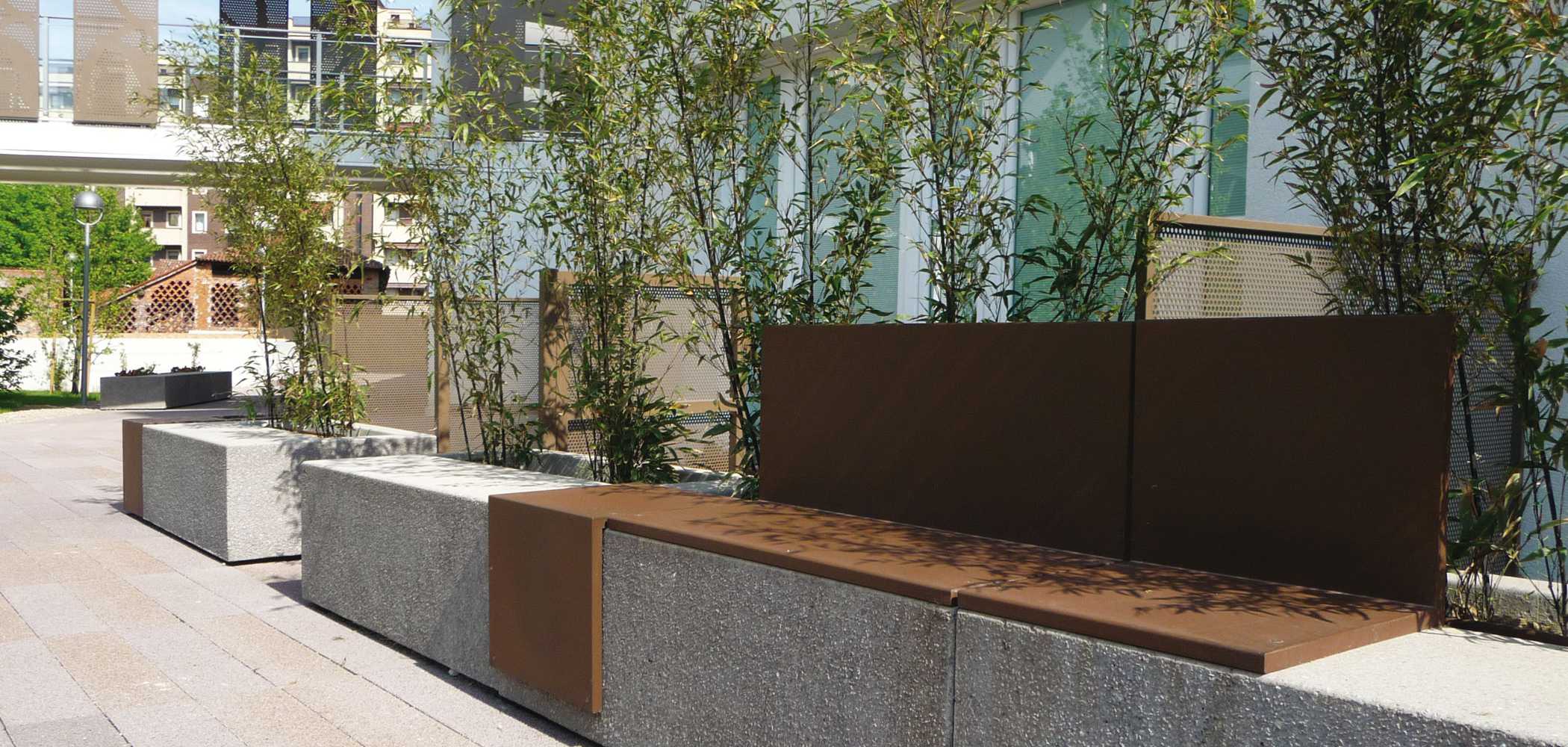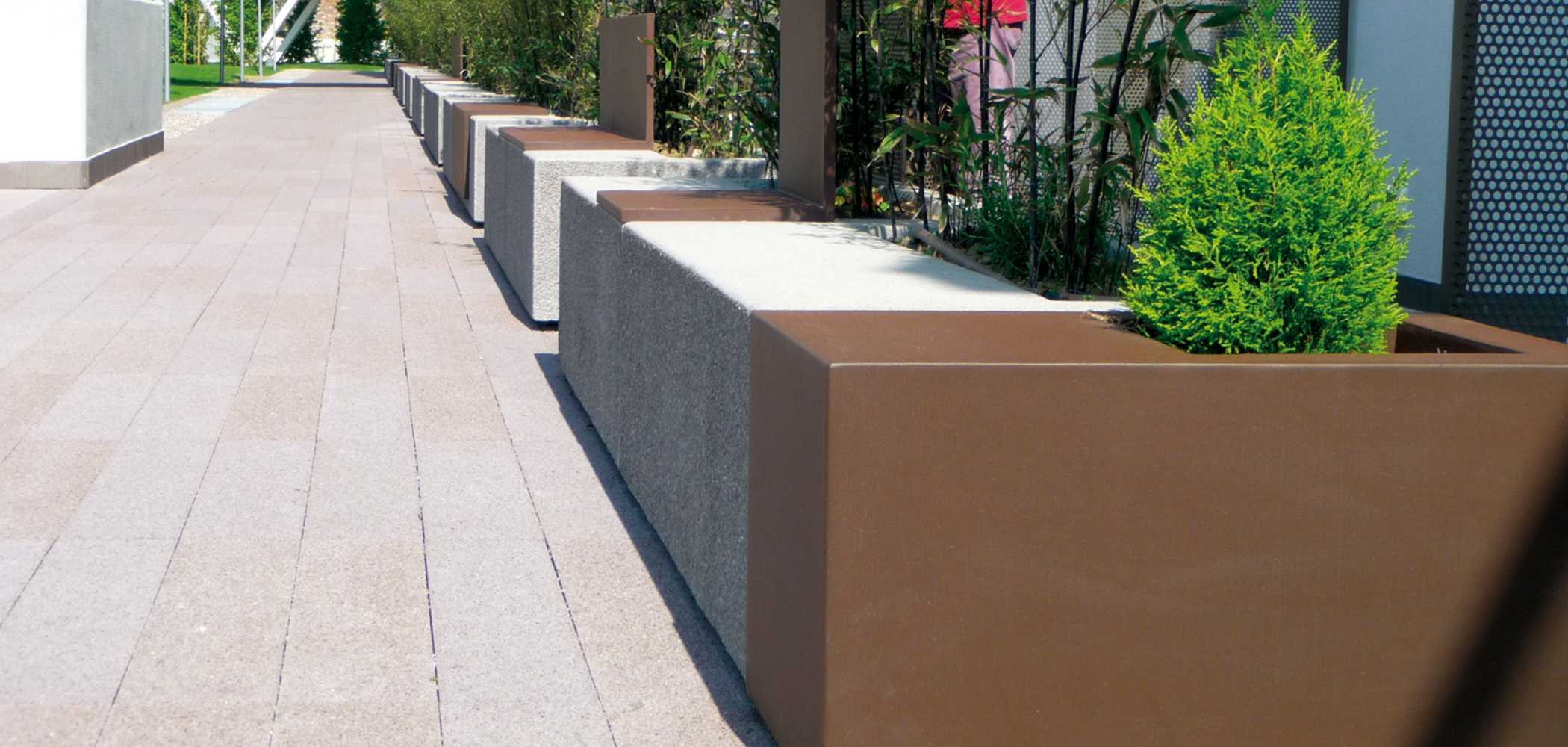 Seduta modulare in due misure con fioriera integrata interamente realizzate in granito o pietra di marmo ricostituiti. Accessoriabile con sedile piano o con schiena in lamiera d’acciaio.